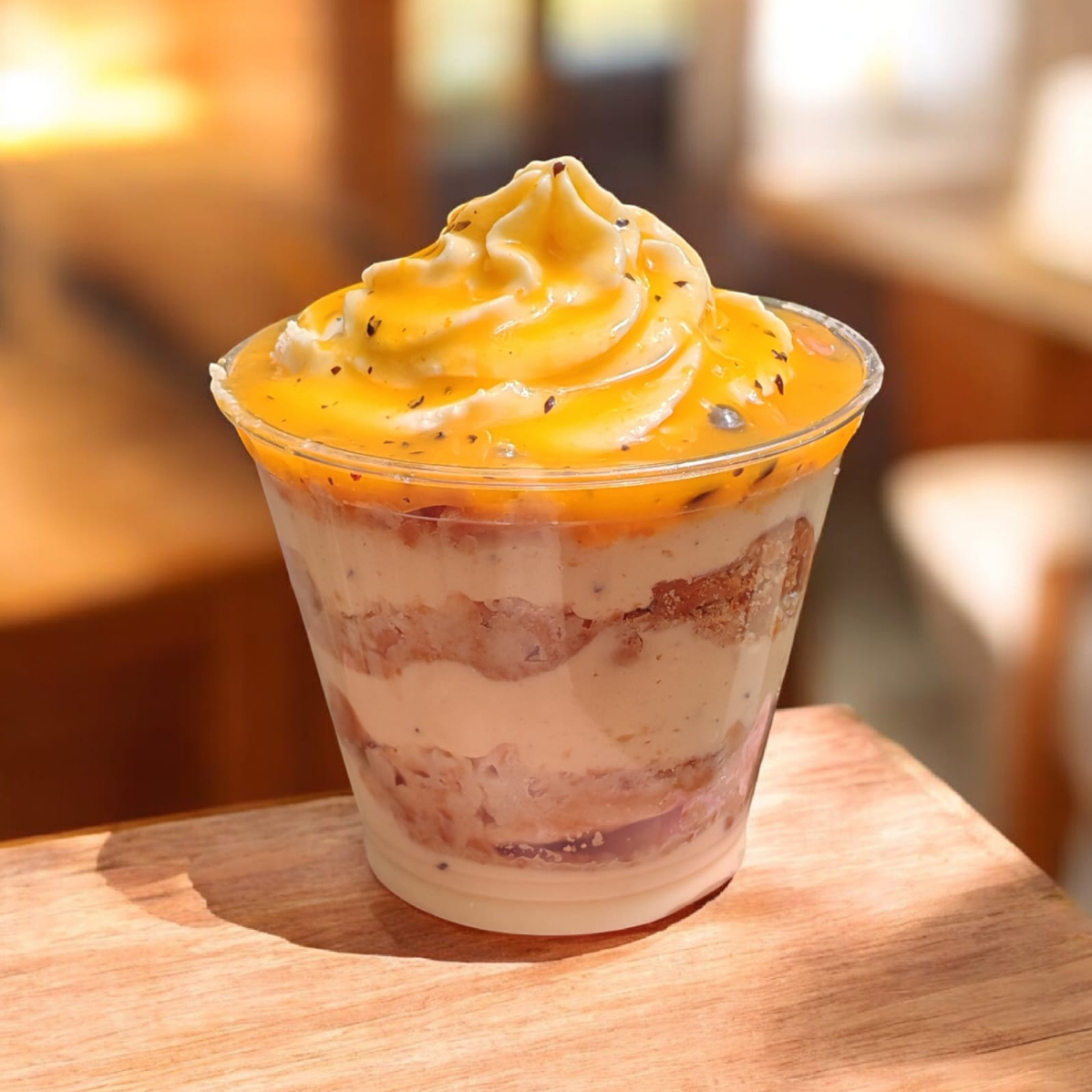 Capas de crema de maracuyá, galletas y mermelada artesanal de la fruta.