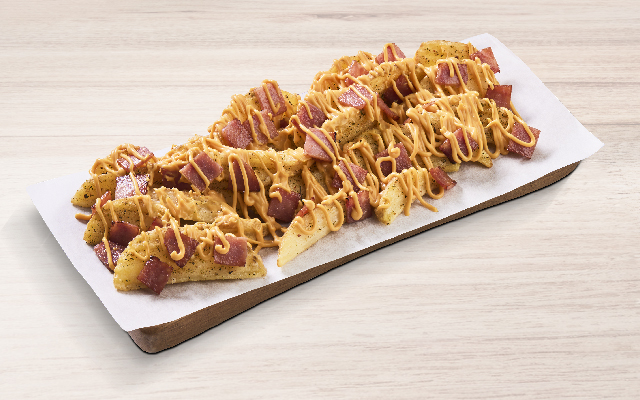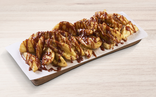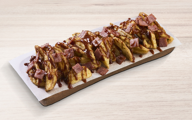 Papas en casco acompañadas con tocineta y salsa BBQ