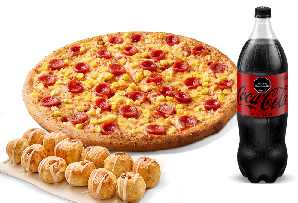 1 Pizza Mediana Masa Original 2 Ingrediente + Arequipe Rolls + Coca Cola Zero 1.5lts.