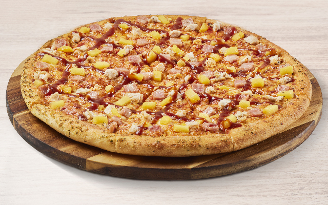 Queso Mozarella, trocitos de pollo, piña, tocineta y salsa B.B.Q.