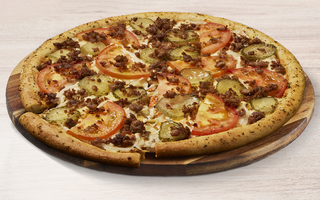 Los sabores clásicos de la hamburguesa ahora un tu Dominos: carne de hamburguesa, queso cheddar, queso mozzarella, pepinillos, cebolla, tomate y salsa de mayonesa ahumada con base de salsa burguer