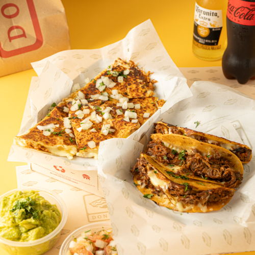 1 Burrito, 3 tacos tipo quesabirrias, 2 bebidas, 2 adiciones.