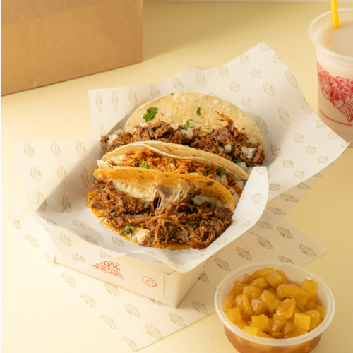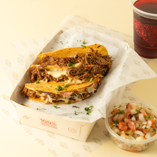 3 Tacos tipo quesabirrias, 1 bebida, 1 adición.