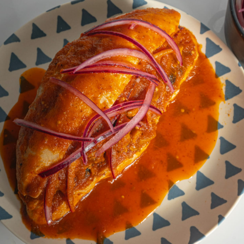 Pan bañado en salsa a base de chiles y tomates (no es picante), relleno de proteína a elección y frijol, con cebolla encurtida.