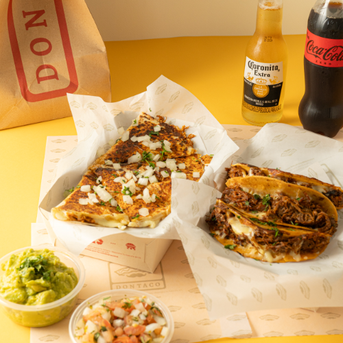 1 Quesadilla, 3 tacos tipo quesabirria, 2 bebidas más 2 adiciones.