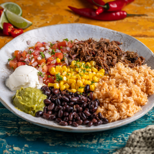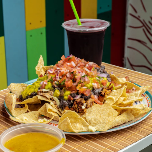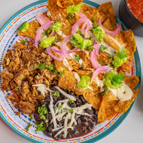 Totopos con proteína a elección, frijol, pico de gallo, guacamole y queso. Si eliges la proteína vegana, no incluye queso.