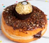 Dona premium con relleno de crema a base de chocolate, glaseado de chocolate con maní y dulce ferrero.