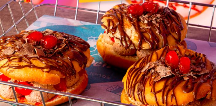 Dona premium con relleno de crema a base de crema suave de chocolate y cereza, glaseado con azúcar glas.