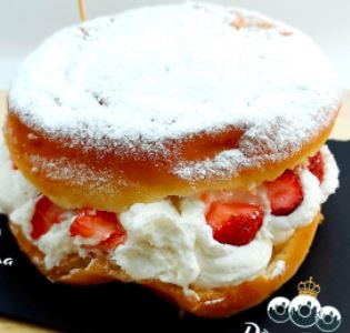 Dona premium con relleno de crema a base de crema suave de chantilly, fresa y remojada con 3 leches gourmet.