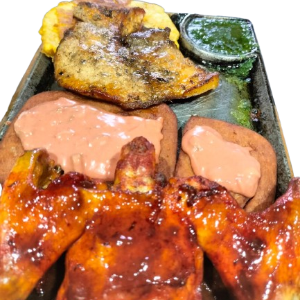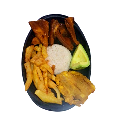 Arroz, Papa a la francesa, patacón, y ensalada del día, Costillas de cerdo bañadas en salsa BBQ, gaseosa mini (colombiana o manzana)