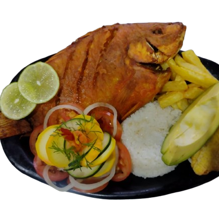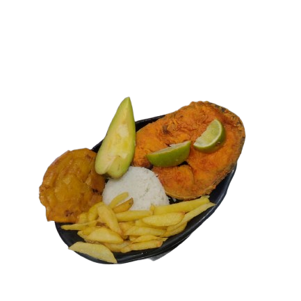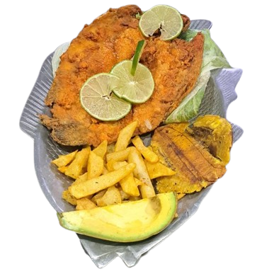 Mojarra frita de 450 gr, Arroz, papa a la francesa, patacón, ensalada del día.
