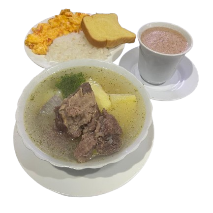 Caldo De Costilla o Pescado, Huevos Al Gusto (Pericos, Revueltos, Fritos) Arroz, Tajada de pan y Bebida Caliente, (Chocolate o Cafe en leche)