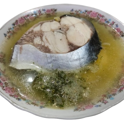 Sancocho de pescado, Rodaja de bagre de 350 gr, Arroz, papa a la francesa, Patacón, ensalada del día.