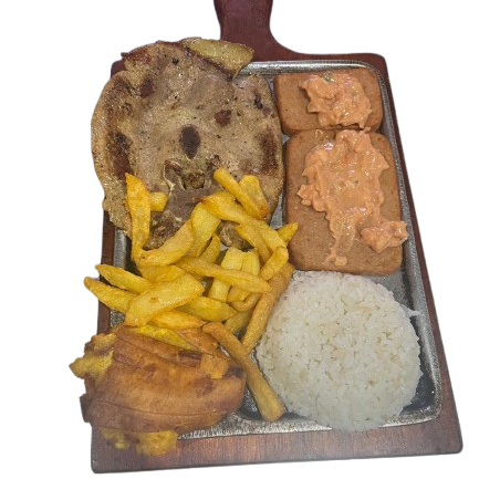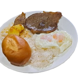 Carne en bistec, Huevos al Gusto (Revueltos, Pericos, Fritos o tortilla) Arroz, Papa bañada en salsa, Pan tajado y bebida caliente (Chocolate o Cafe)