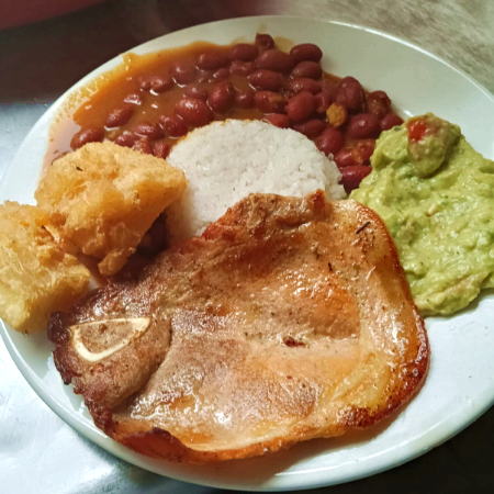 Sopa del dia, Carne de res, Carne de cerdo, Pollo, Acompañado de Arroz, Papas a la Francesa, Patacón, Ensalada del dia