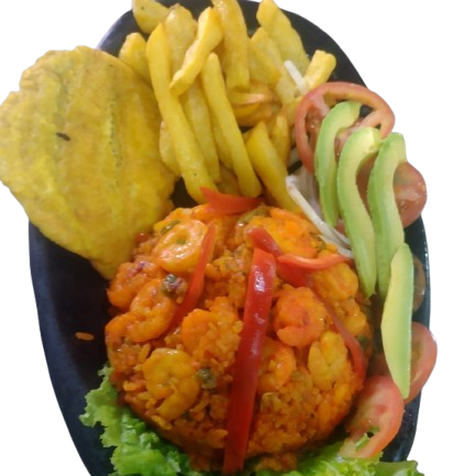 Arroz Con Camarones Acompañado de Verduras, camarones, pimenton, Papas a la francesa, patacon y ensalada del dia.