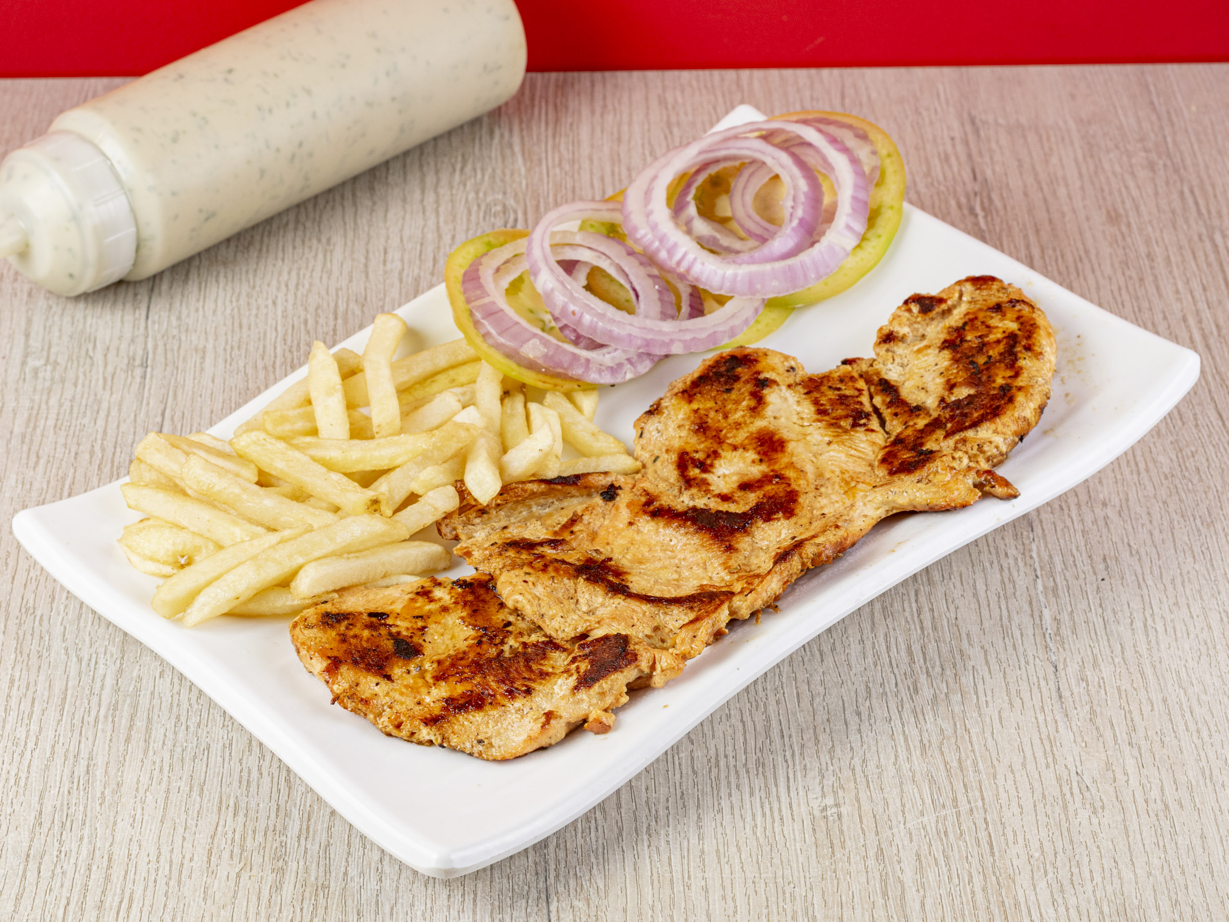 Pan de hamburguesa, 2 porciones de pollo, queso doble crema, tomate, cebolla, lechuga, salsa de tomate, salsa tártara, salsa mostaza.