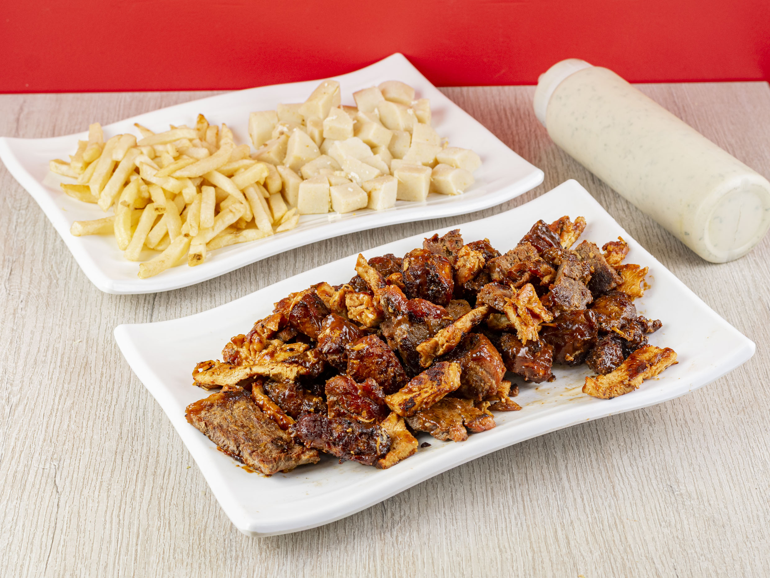 Picada con papa francesa, churrasco, pechuga, costilla, bollo limpio, salsa BBQ.
