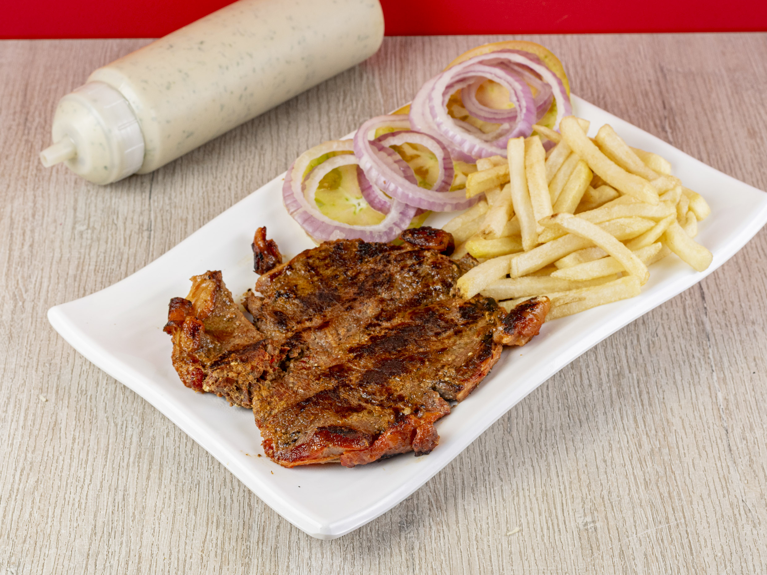 Costilla de 580 g con papas a la francesa, salsa BBQ.