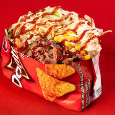 Doritos, pollo desmechado, queso mozzarella, maíz, salsa BBQ, salsa de ajo.