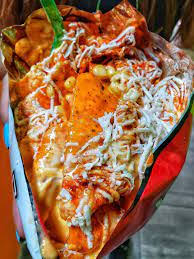 Doritos, salchicha, chorizo, carne desmechada, maíz, queso rallado, limón, todas las salsas (rosada, piña, BBQ, picante).