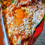 Doritos, carne molida (bien sazonada), salchicha, queso cheddar, pico de gallo, salsa BBQ, salsa picante.