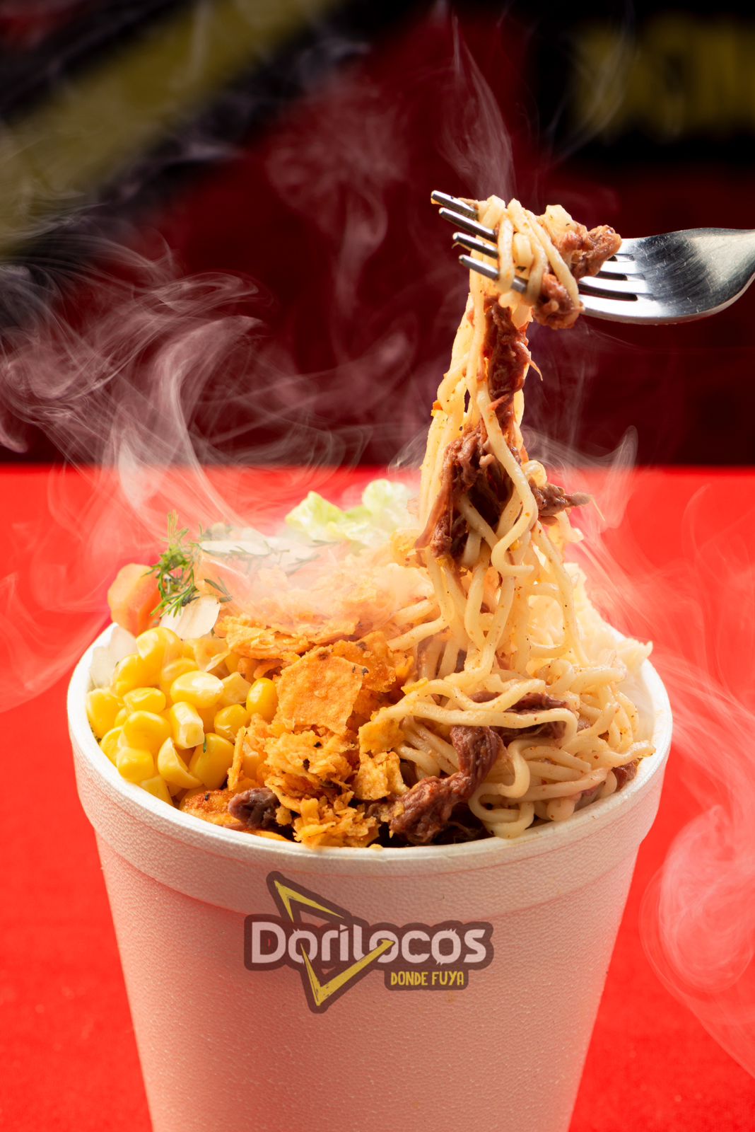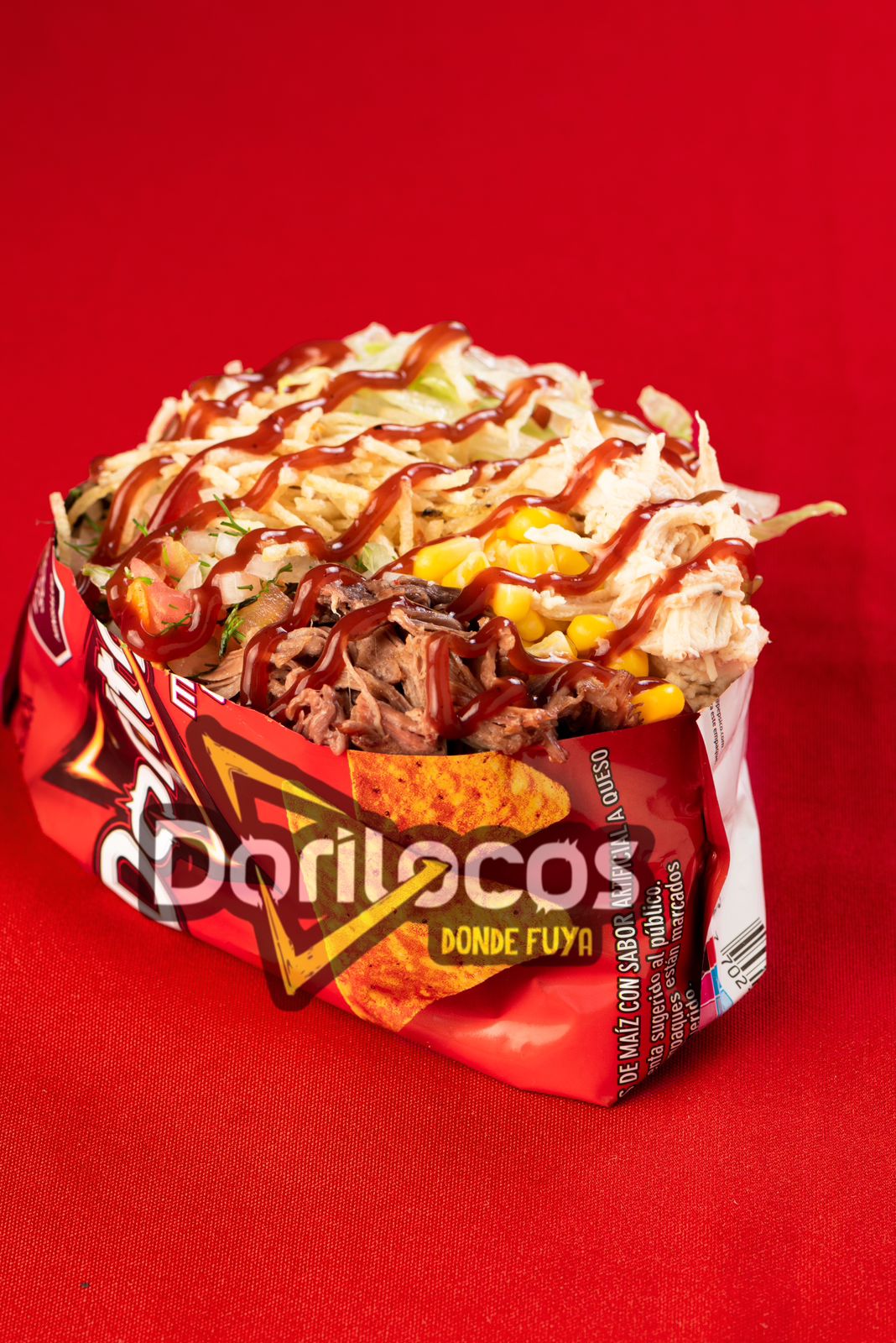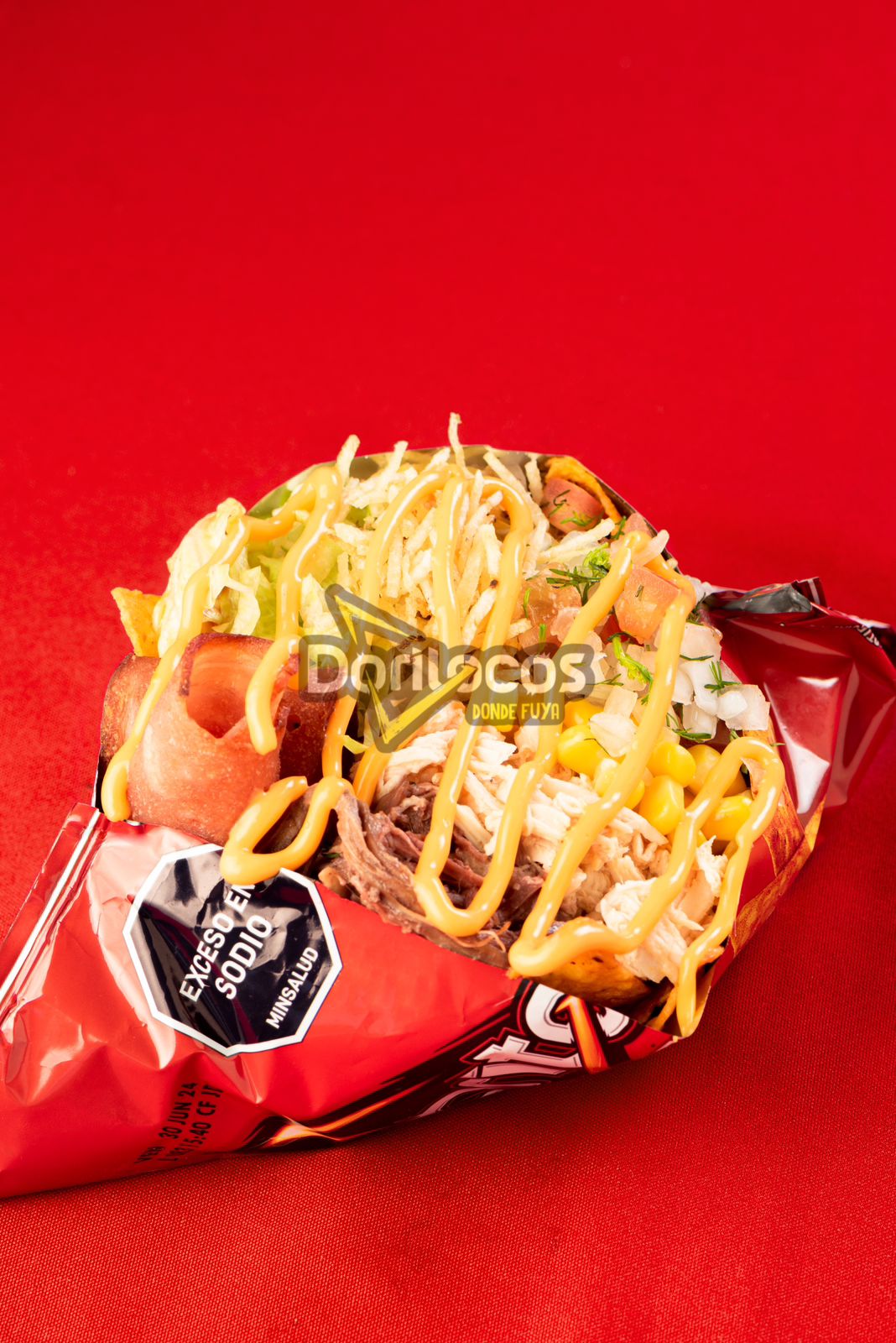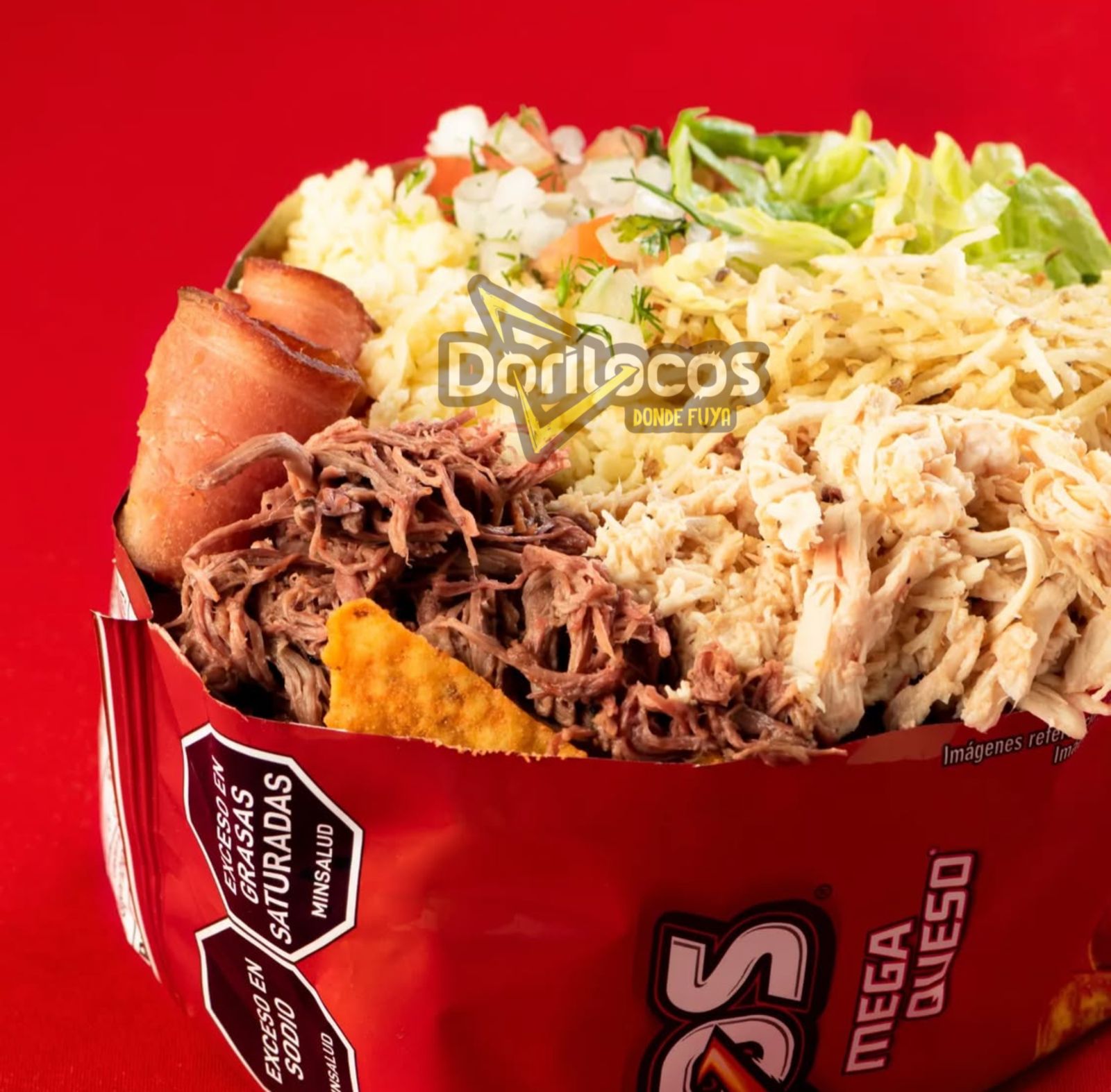 Ajinomén, carne o pollo, pico de gallo, lechuga, maíz dulce, queso, doritos triturados y 3 salsas.