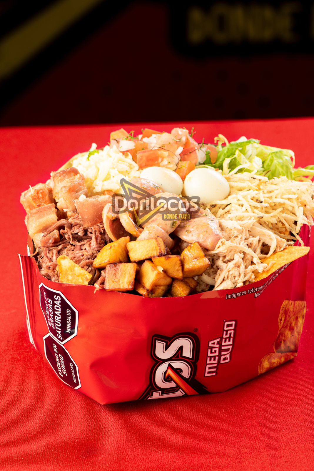 Ajinomén, carne o pollo, pico de gallo, lechuga, maíz dulce, queso, doritos triturados y 3 salsas más Coca Cola 500 ml.