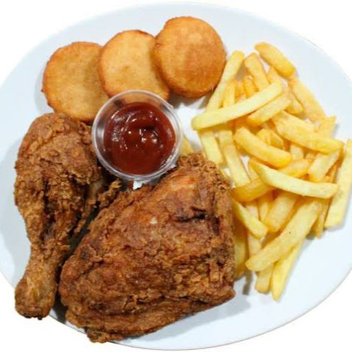 Salchicha long de casa, papa a la francesa, pollo con champiñones, queso y salsas.