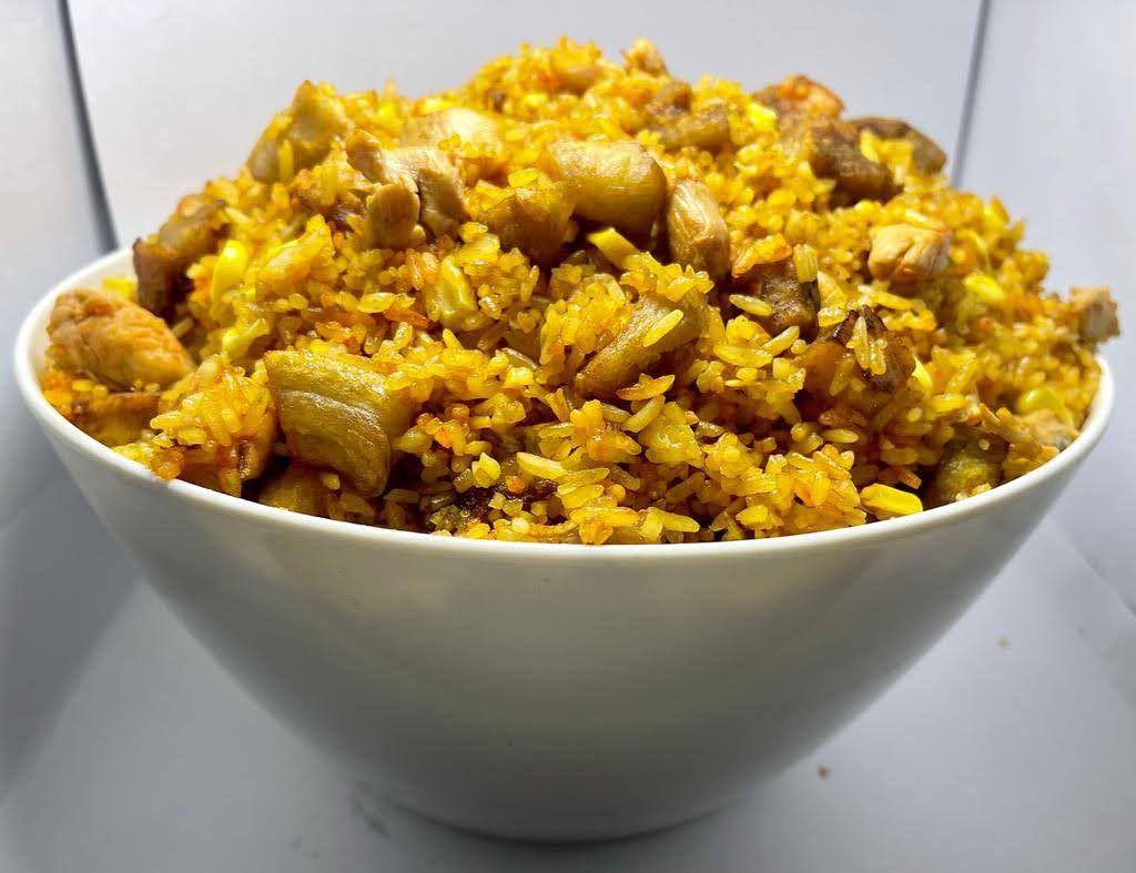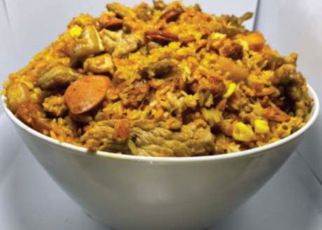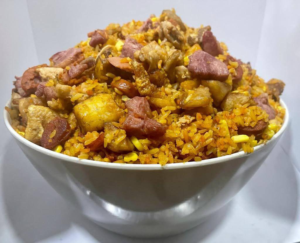 Arroz con trocitos de pollo, lomo de cerdo, chicharrón, plátano maduro, maíz tierno, salchicha, chorizo y camarón