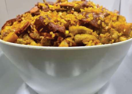 Arroz con trocitos de pollo, lomo de cerdo, chicharrón, platano maduro, maiz, chorizo y camaron