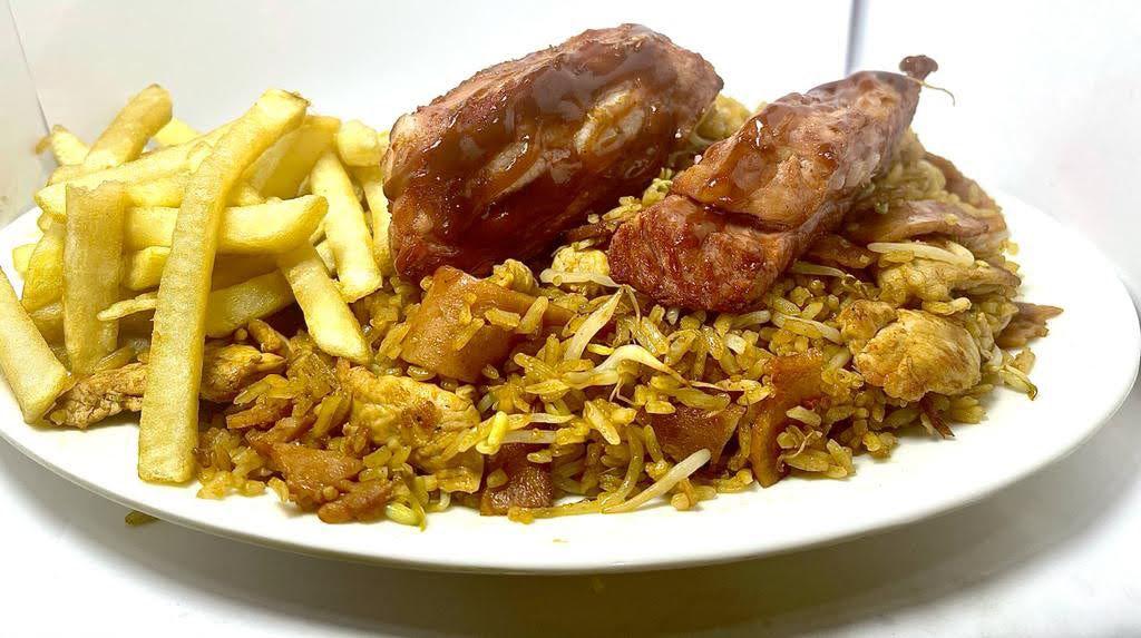 Arroz con trocitos de cerdo, jamón y raíces chinas + 200 gr de costillas BBQ.