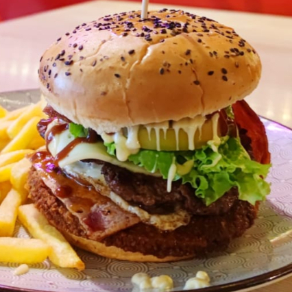 Pan artesanal, 2 carnes, 2 quesos, costillas BBQ, chorizo, chicharrón, tocineta, tajadas de maduro, cebolla caramelizada con teriyaki y salsa de la casa.