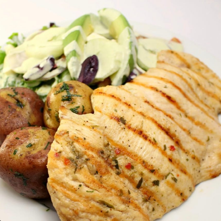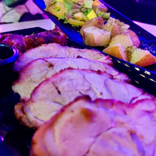 carne de cerdo ahumada al barril acompañada de papa salada y ensalada