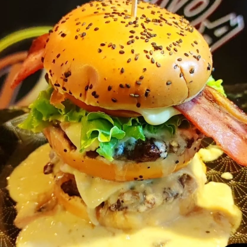 Pan artesanal, 2 carnes artesanales, queso, tocineta, salsa de champiñones, lechuga, tomate y cebolla caramelizada con teriyaki.