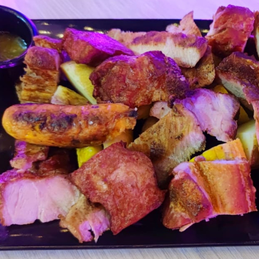 Res, pollo, costillas, chorizo, tocineta, papas cabello de ángel, maíz dulce, queso, salsa BBQ y salsa de maíz.