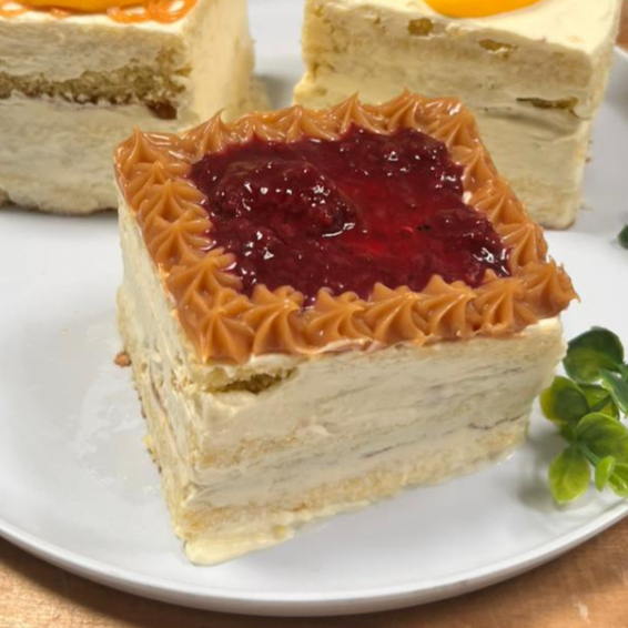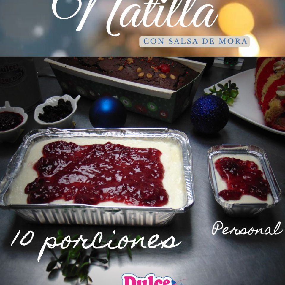 Deliciosa mezcla de bizcochuelo, natilla, dulce de mora y arequipe. Contiene huevo, gluten y leche.