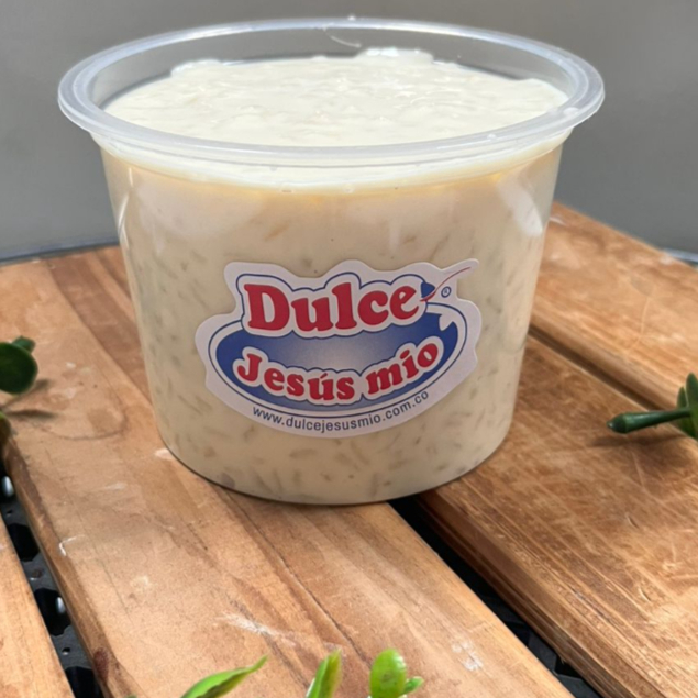 Arroz preparado en nuestra deliciosa mezcla de tres leches. Tamaño para compartir aproximadamente 1 litro, acompañado de uvas pasas. Contiene leche