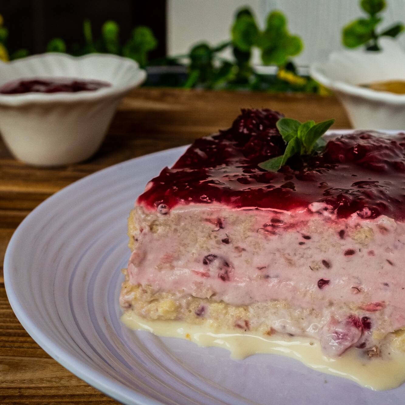 Bizcochuelo de vainilla con trocitos de mora entre capas bañado en nuestra mezcla de tres leches cubierto de mermelada con trozos de mora. Contiene: leche, huevo y gluten