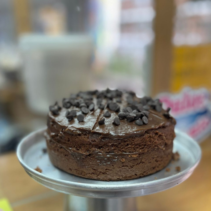 Bizcochuelo de vainilla con crema de chocolate entre capas bañado en nuestra mezcla de tres leches cubierto de crema de chocolate con rayadura de chocolate. Contiene: leche, huevo y gluten