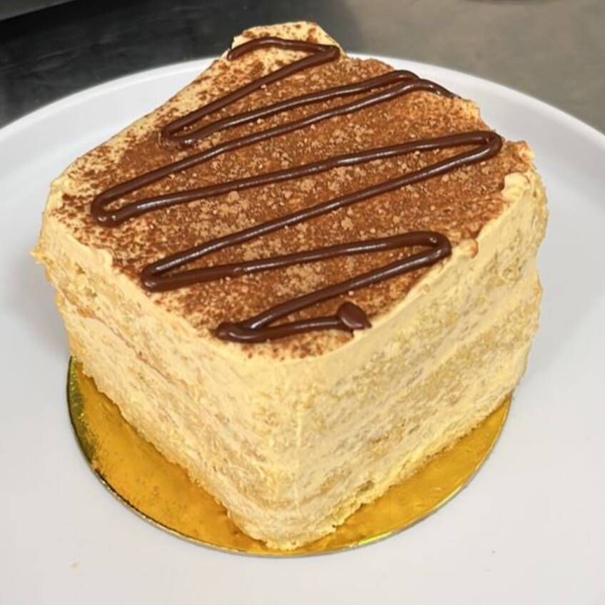 Bizcochuelo de vainilla con crema de café entre capas bañado en nuestra mezcla de tres leches cubierto de crema de café y crocante de galleta. Contiene: leche, huevo y gluten