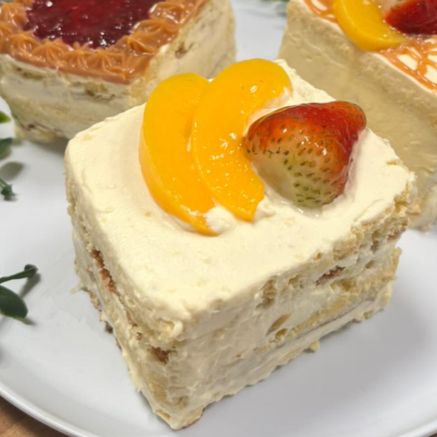 Bizcochuelo de vainilla con trocitos de durazno, guanábana y fresa entre capas bañado en nuestra mezcla de tres leches cubierto con trozos de melocotón y fresas. Contiene: leche, huevo y gluten