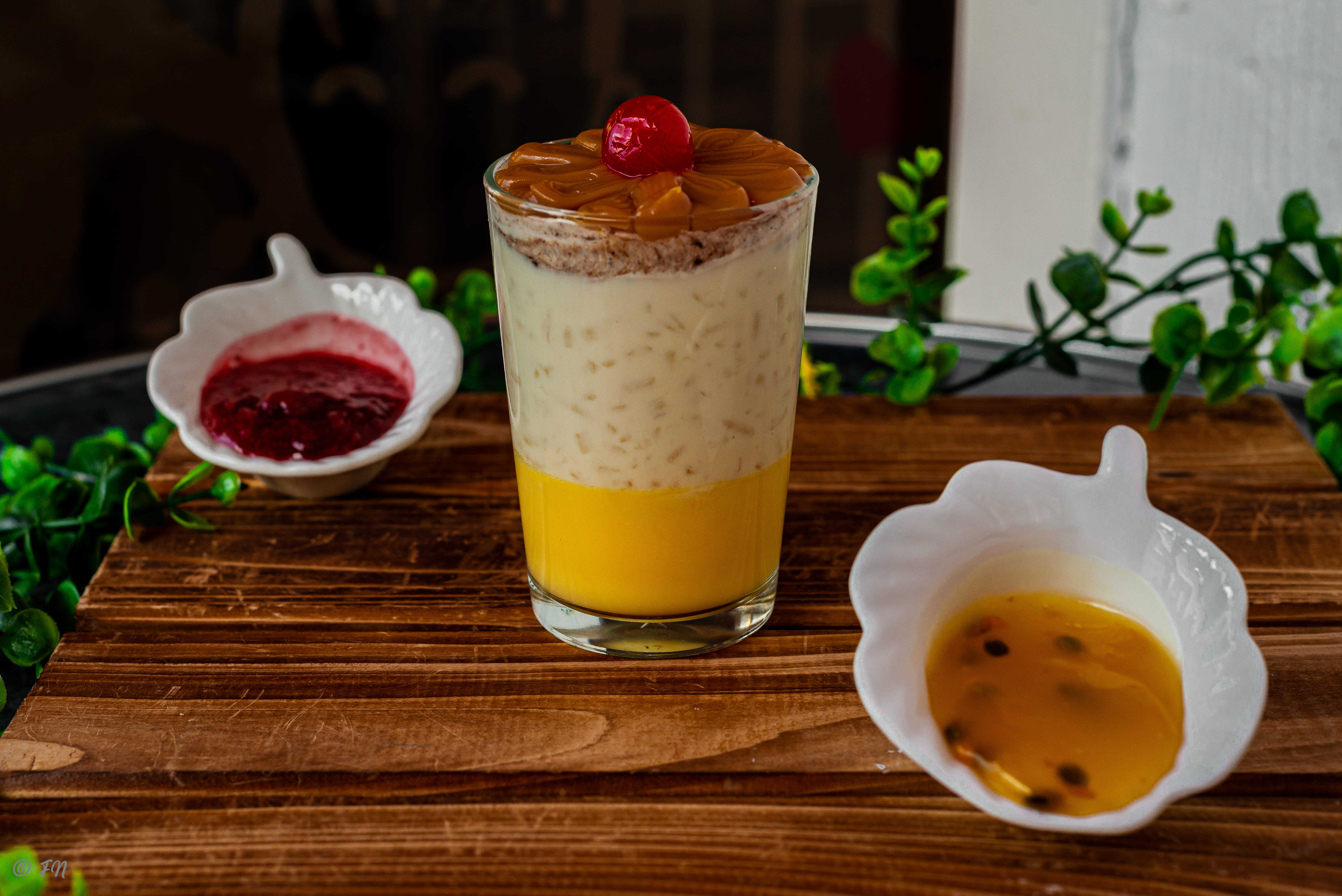 Postre cremoso con mezcla de flan, arroz con leche, crema de chocolate y arequipe. Contiene huevo y leche.