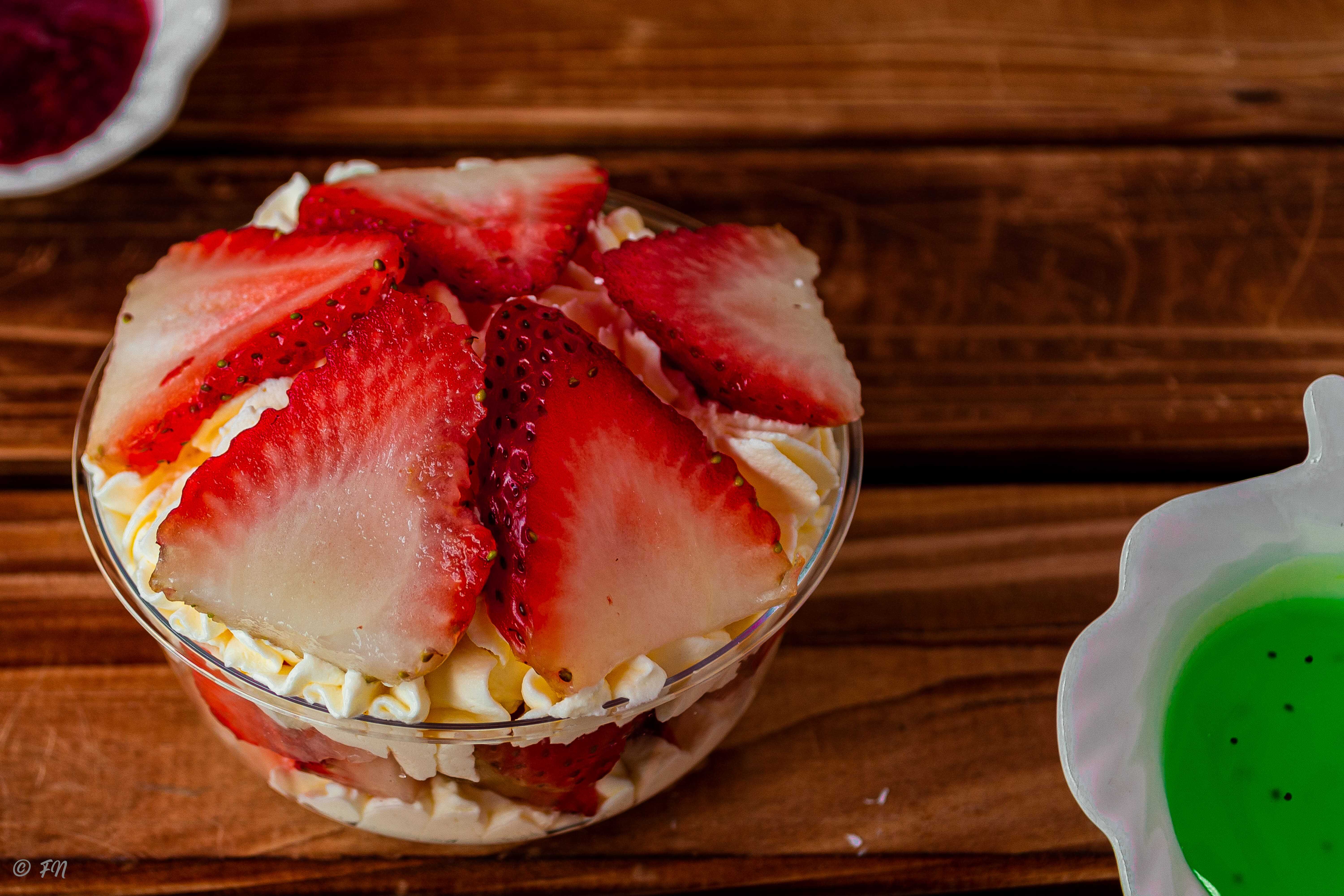 Crema batida con trocitos de fresa. Contiene leche.