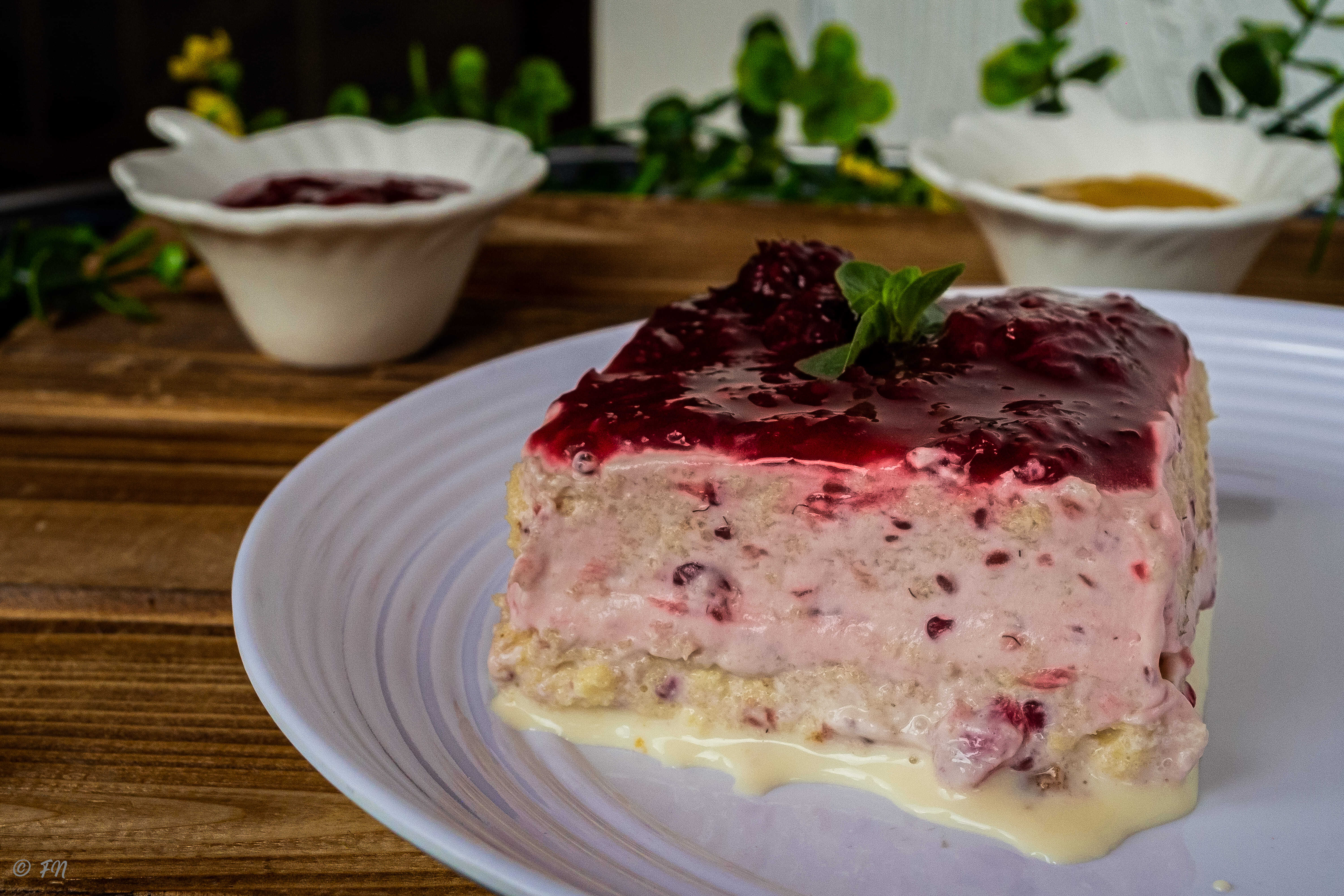 Bizcochuelo de vainilla con trocitos de mora entre capas bañado en nuestra mezcla de tres leches cubierto de mermelada con trozos de mora. Contiene: leche, huevo y gluten