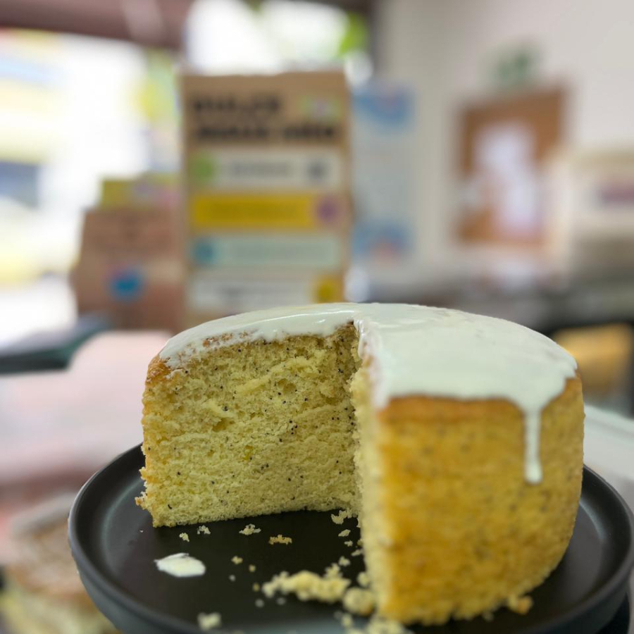 Porción de torta a base de harina de trigo con sabor a naranja con semillas de amapola