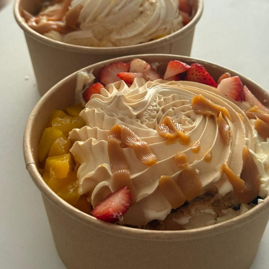 Merengue en base de bizcochuelo de vainilla bañado en tres leches con crema batida y trozos de frutas a tu elección (3 toppings). Contiene huevo, leche y gluten. (melocotón, fresa, mora, frutos rojos, dulce guayaba, arequipe)