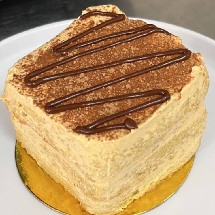 Bizcochuelo de vainilla con crema de café entre capas bañado en nuestra mezcla de tres leches cubierto de crema de café y crocante de galleta. Contiene: leche, huevo y gluten