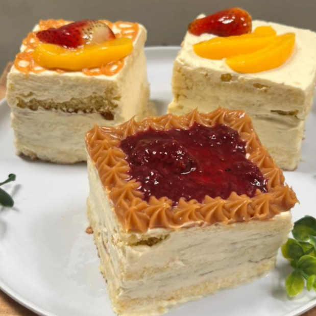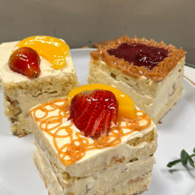 Bizcochuelo de vainilla con trocitos de melocotón y fresa entre capas bañado en nuestra mezcla de tres leches cubierto con trozos de fruta y arequipe. Contiene: leche, huevo y gluten