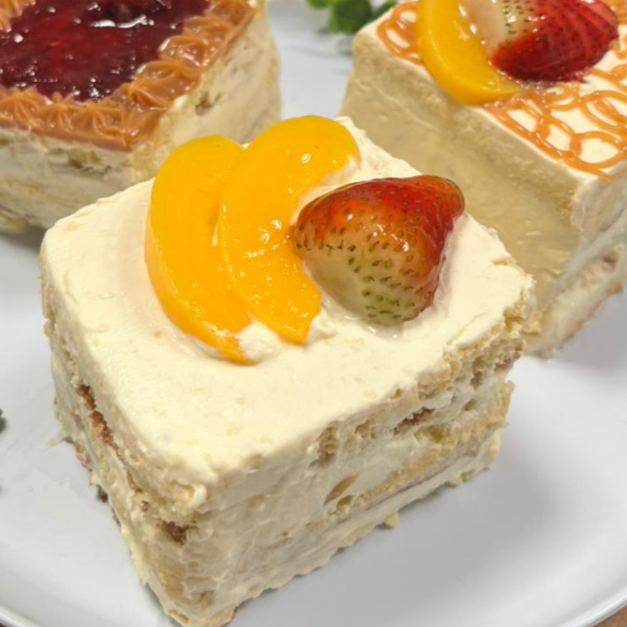 Bizcochuelo de vainilla con trocitos de durazno, guanábana y fresa entre capas bañado en nuestra mezcla de tres leches cubierto con trozos de melocotón y fresas. Contiene: leche, huevo y gluten
